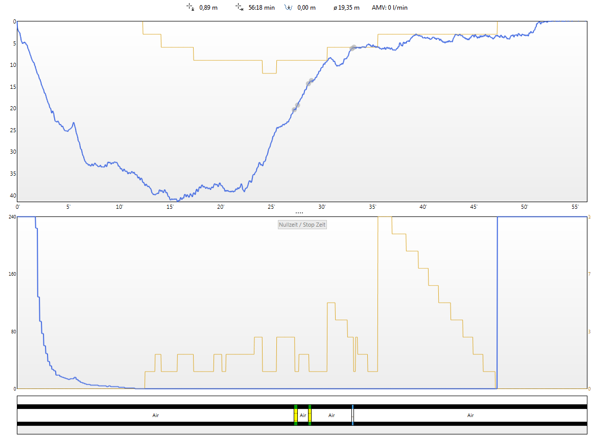 Dann gab es mal ein Firmware-Update, wo dieser Anzeigeprozess geändert wurde. Danach reduzierte sich nicht mehr die Zeit wie oben beschrieben, sondern die 40 Minuten bleiben nach dem Gaswechsel auf O2 stehen, laufen aber nun schneller ab. Also der Rechner lässt dich trotzdem nach den 17 Minuten aus dem obigen Beispiel aus dem Wasser (das sehe ich im Vergleich zu dem 4er) aber die „falschen“ 40 Minuten Dekozeit laufen innerhalb "tatsächlichen" 17 Minuten ab.