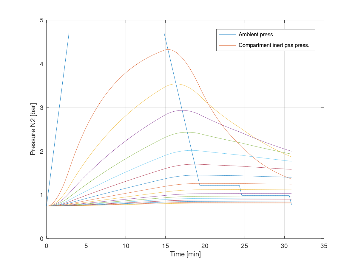 Basically it is good that using the integral dp/dt = -log(2)/halftime*(p(t) – pamb) or -(p(t)-pamb)*e2sec give the same result. But the same results is still that pressures for some tissues become larger than allowed (super-saturation).